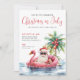 Invite guests to your Christmas in July celebration with this fun and festive party invitation, designed with a playful tropical twist. At the bottom, the artwork features a relaxed Santa Claus in sunglasses lounging in a pink flamingo floaty, surrounded by ocean waves and a sunny beach vibe—perfect for a warm-weather holiday bash.
