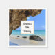Paper napkins with a scenic nature photograph. Beautiful turquoise blue sea with a sandy beach. A big brown rock provides some shade from the bright blue sky.