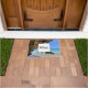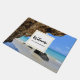 Welcome doormat with a scenic nature photograph. Beautiful turquoise blue sea with a sandy beach. A big brown rock provides some shade from the bright blue sky.