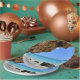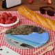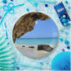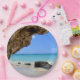 Paper plates with a scenic nature photograph. Beautiful turquoise blue sea with a sandy beach. A big brown rock provides some shade from the bright blue sky.