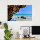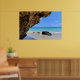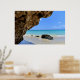 Poster with a scenic nature photograph. Beautiful turquoise blue sea with a sandy beach. A big brown rock provides some shade from the bright blue sky.