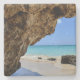 A stone coaster with a scenic nature photograph. Beautiful turquoise blue sea with a sandy beach. A big brown rock provides some shade from the bright blue sky.