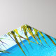 A gorgeous photograph of a tropical beach. The water is crystal clear and azure blue. The image is framed with some sheltering palm fronds. The beach has nice white sand. A very calming relaxing image.