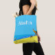 This shoulder tote bag is personalised with your name. It features a digital art photo print of Benaulim Beach in Goa, India. The print is stylised and shows the vast beach in bright yellows against a turquoise blue sea and sky. The prow of a local boat hung with beads is on the right hand side and you can see cows and cyclists on the beach. The main colours are the yellow sand and the bright turquoise blue of the sky. Choose from medium or large sizes.