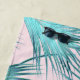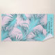 A great idea for your beach house or vacation home, this custom beach towel design has a fresh and trendy tropical palm frond pattern in cool icy aqua/turquoise blue over a blush pink background adding the allure of the islands. The bottom portion of the towel has a matching band of colour with a text template for personalising with your family name or other desired text.