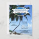 Retirement party invitation featuring lounge chairs on a tropical beach with palm trees. Perfect for anyone looking forward to a relaxing pension. If you do not need the top stylised image over the trees, you can copy the image from the back and paste it to the front.