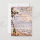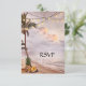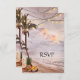 Modern RSVP card featuring a sunset on the beach with string lights and palm trees. At the foot of the tree are a pineapple with flowers. You can customise all texts. This RSVP card matches invitations.