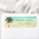 A tropical blue sky and beach sand image with a brown palm tree illustration.