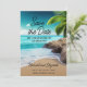 Wedding Save the Date card with a photo of a turquoise ocean, beach, and palm tree, and personalised with your favourite engagement photo on the back. Order prints of this card or purchase a digital copy that you can send to friends and family through email or share on social media.