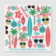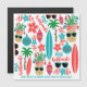 Tropical beach theme magnetic Christmas card features a pattern of surfboards, palm trees with string lights, decorated pineapples, hibiscus flowers, sunglasses, ornaments and the Hawaiian greetings "Mele Kalikimaka" and "Aloha". Perfect for beach, coastal, island and surfing themes. Original artwork KL Stock.