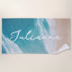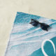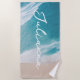 Tropical Beach Sand Ocean Waves beach towel features an aerial view of blue ocean waves coming up onto a sandy beach. Personalise it with your name in a stylish, white script font.