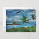Escape to paradise with our Tropical Beach Scene Art Print. This idyllic coastal artwork beautifully captures the essence of a tropical beach, featuring swaying palm trees, a charming thatched hut, and a scenic jetty. A woman in a flowing white dress strolls along the shore, surrounded by lush green vegetation, creating a serene and inviting atmosphere.