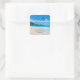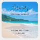 Business stickers with a photograph of a gorgeous vacation location. Bright blue sky, soft sandy beach with tropical crystal clear blue waters. A lush tree covered mountain in the background. Scenic and tranquil photography.