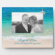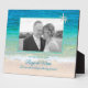 Newlywed photo gift with tropical seas background. This standing 8x10 inch plaque will have the couple’s photo printed on it to preserve the memories. Two tiny white sea stars / starfish decorate the upper corner of the thin, line frame. Upload a horizontal (landscape) orientation picture from the wedding and customise three lines of sea blue text beneath. Sample text has the date of the wedding, names of the bride and groom, with a line for a saying or verse. Sample wording is, “To have and to hold from this day forward.” Turquoise ocean water and surf at the sandy shore is the background image. Read more about this product in the description below.