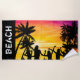 Trendy coastal beach sunset beach towels designed in bold colourful design with palm trees and people celebrating fun at the beach in silhouette. Includes grunge style text that says BEACH in cool lettering style.