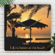 Wall clock featuring a sunset at a tropical beach with your custom text (optional).