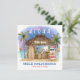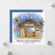Tropical, square Christmas card features Santa enjoying a vacation at a Tiki bar on the beach under the moon and stars with palm trees, holiday string lights and Hawaiian "Aloha" and "Mele Kalikimaka" greetings. Tropical cocktails, a pineapple, hibiscus and palm leaves, a surfboard and a parrot in a pirate hat decorate the bar area. The reverse side is a twilight blue, and the greeting and names can be personalized. Art by KL Stock