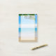 Large size sticky notes personalised with your own information. A landscape photograph of a tropical beach. Azure water and blue sky with gentle waves lapping at the shore with some clouds in the distance. Some tropical leaves at the top. A semi-transparent overlay with a gold border in the centre for legible writing.