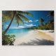 The perfect vacation would be here, on this tropical beach with blue water, graceful palm trees, and blue skies over a sandy shore.