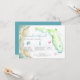 Each illustrated itinerary timeline features your names in a flowing turquoise script, with event details in a classic charcoal serif font on a crisp white background. The custom hand-painted map of Florida includes watercolor icons like a sea turtle, pink flamingo, heart, and blue cocktail — each one movable to mark your exact wedding location. A soft ocean wave border and coordinating blue reverse side complete the look.