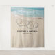 Beach destination photo prop tapestry featuring a summer tropical ocean island background, a vintage sandy beach with two hearts in the shoreline, your initials, name, and wedding date.