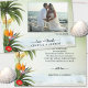 Wedding Thank You card featuring your own favourite wedding photo framed by a tropical beach scene with palm trees, festive lanterns and colourful exotic flowers, overlooking a light teal green ocean. (Your photo should automatically rotate to fit the frame).