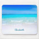 A personalised mouse pad with a sandy tropical beach. A gorgeous turquoise sea in the distance and crystal clear waters caressing a sandy beach. A bright blue sky in the background.