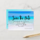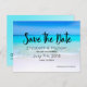 A wedding save the date postcard. Designed with a sandy tropical beach. A gorgeous turquoise sea in the distance and crystal clear waters caressing a sandy beach. A bright blue sky in the background.