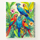 Journal in vividly coloured tropical birds surrounded by lush green foliage and vibrant flowers. The birds display brilliant shades of red, blue, yellow, and green. The scene depicts exotic beauty and rich botanical detail.