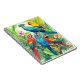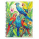 Notebook in vividly coloured tropical birds surrounded by lush green foliage and vibrant flowers. The birds display brilliant shades of red, blue, yellow, and green. The scene depicts exotic beauty and rich botanical detail.