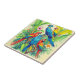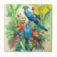 Ceramic tile in vividly coloured tropical birds surrounded by lush green foliage and vibrant flowers. The birds display brilliant shades of red, blue, yellow, and green. The scene depicts exotic beauty and rich botanical detail.