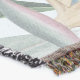 A quality printed throw has its advantages. This is a much finer weave throw than its loopier cousins, and though lighter, it is worth the investment for custom room accessorizing. The back is much prettier than the typical brown, and the fringe on the long sides very vivid, the selvage nicely done. Before photographing, I washed the throw in cold water, delicate, with a thicker woven throw the same size. On tumble dry low, this throw was dry in half the time as the other. This is a very practical quality if you use throws for furniture covers or to wrap up in frequently. The sleekness of the fabric makes it a great layer for accenting or protecting without the feeling of sitting on too much stuff. Perfect for napping or when you feel a light chill coming on. The color printing is beautiful and on this fabric, matched the design and color of my Photoshop image. This is an advantage for blending room fabrics and colors. The fringe on the short sides prints the colors from the design image and therefore varies from the side fringe. I streaked a white fractal line through the plaid pattern to give the illusion of weaving. This printed as crisp as an illusory thread, and put some white in the short side fringe, showing another advantage of print vs loomed- for artistic purposes, line lines, detail, and color integrity can be planned and preserved. My loomed throws have color limitations and more of a needlepoint texture. Print throws reproduce an exact image. The throw felt a little stiff straight out of the package, but this went away in the first delicate wash. Of course I searched the wash water for ink or bleeding and there was none.