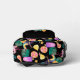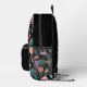 A toucan bird, a pink flamingo, and a bright pineapple combine with an ice cream cone, ice cream bars, a bright grapefruit slice, and a lemon, along with gold stars and green palm leaves to form a fun tropical pattern on this backpack. The multi coloured, bright images are placed on a dramatic black background. Bright, colourful and fun, no matter where you spend the summer!