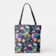 A toucan bird, a pink flamingo,  and a bright pineapple combine with an ice cream cone, ice cream bars, a bright grapefruit slice, and a lemon, along with gold stars and green palm leaves to form a fun tropical pattern on this bag. The multi coloured, bright images are placed on a navy blue background, and repeated on the back side of the bag. Bright, colourful and fun, no matter where you spend the summer!