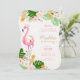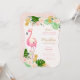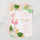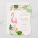 Aloha! A frame of hand drawn watercolor invite with a pink flamingo surrounded with tropical pink and green pastel flowers and gold pineapples. Hula away with this tropical Hawaiian luau invitation
