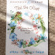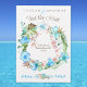 Announce your tropical elopement ceremony with a blue, green, and brown hibiscus wreath. Beautiful blue hibiscus flowers, light green banana leaves are beautiful with blue and turquoise sea turtle border. Brown and green monstera leaf compliments the light blue floral arrangement. A beautiful match for malibu blue or Bahama blue wedding invitation colour palettes.