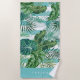 Add tropical flair to your beach or pool days with this cool botanical printed beach towel in beachy shades of green, turquoise and white. Design features a pattern of green banana leaves, monstera, and palm fronds overlaid on aqua and white stripes. Personalize with an individual name, family name, or monogram along the bottom in classic white lettering.