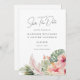 This elegant wedding save the date features gorgeous watercolor botanicals including palm leaves and hibiscus. The typography is classic yet modern. This is the perfect design for a tropical or beach destination wedding. See the collection for more coordinating items.