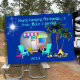 Tropical camping Christmas cards. A tropical night scene with palm trees next to a little silver travel trailer is the image with greeting and signature at the top. "Merry Camping Christmas" is the sample wording, with a place for the year at the bottom of the card. Text is bright aqua blue in a modern, printed font. The night sky has one large shining star with others twinkling. The two palm trees are draped in a string of lights and a campfire burns beneath them. The brightly coloured awnings, plastic pink flamingos and a little seashell finish off the tropical theme.