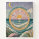 This vibrant, illustrative piece combines nautical scenery with mystical celestial symbols. At its center, a large circular window frames a tranquil sunrise or sunset over rolling ocean waves, rendered in a soothing palette of teal, seafoam, and lavender. Outside this frame, lush tropical foliage and palm fronds anchor the foreground, while the upper sky transition into a twilight scene featuring a golden crescent moon and shimmering stars. The artwork utilizes a mix of flat graphic shapes and soft watercolor textures, creating a peaceful, dreamlike coastal atmosphere that feels both modern and mythical.