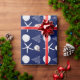 Dark navy blue with white, tropical themed Christmas gift wrapping paper on a roll. White sand dollars, starfish, Christmas tree art, and holiday ornament, is the pattern that covers paper with options.