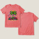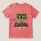 T-shirt with a seasonal holiday image. A tropical palm tree decorated in festive lights with a star on top. A giant red and white candy cane sticking out of the sand. Christmas presents under the tree. Whimsical and fun.