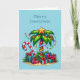Christmas holiday card with a seasonal holiday image. A tropical palm tree decorated in festive lights with a star on top. A giant red and white candy cane sticking out of the sand. Christmas presents under the tree. Whimsical and fun.