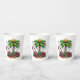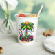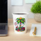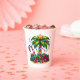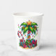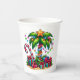 Paper cups with a seasonal holiday image. A tropical palm tree decorated in festive lights with a star on top. A giant red and white candy cane sticking out of the sand. Christmas presents under the tree. Whimsical and fun.