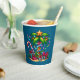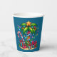 Paper cups with a seasonal holiday image. A tropical palm tree decorated in festive lights with a star on top. A giant red and white candy cane sticking out of the sand. Christmas presents under the tree. Whimsical and fun.