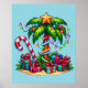 Poster with a seasonal holiday image. A tropical palm tree decorated in festive lights with a star on top. A giant red and white candy cane sticking out of the sand. Christmas presents under the tree. Whimsical and fun.
