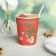 This custom Christmas holiday party cup features a cute cartoon illustration. Two pink flamingos are having a party with gifts and Christmas lights. A cute little snowman is standing in front of a tropical palm tree. The background is a vibrant orange colour.