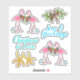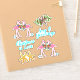 Fun, shaped Christmas stickers with tropical themes. Custom wording and flamingos and starfish shapes. "Seas and greetings" and "Christmas is love” can be changed to sayings of similar size. The pink flamingos wear festive floral wreaths, stand among sea stars. Peel and stick to gift packages, party favours, or greeting card envelopes. The larger size stickers, 6 inch and up, work best for this product.