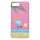 An illustration of a tropical cocktails in bright pink and blue on a beach background with pink sky and accented with palm leaves and seagulls, decorate this iPhone 7 Plus Case, reminding us of warm sunny vacations.