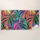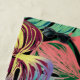 Features a bold, modern style painted palm leaf print in tropical colours of coral, turquoise, yellow and pink. Set against a black background.